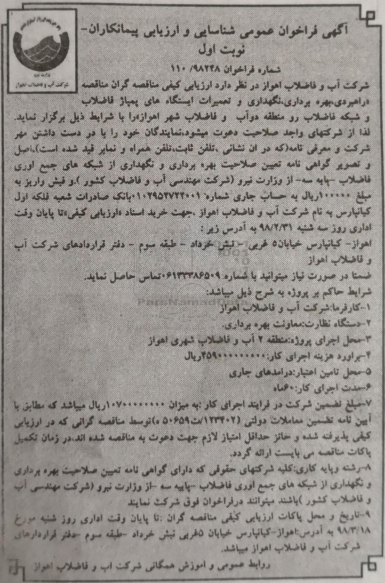 شرکت آب و فاضلاب اهواز در نظر دارد ارزیابی کیفی مناقصه گران مناقصه راهبردی، بهره برداری، نگهداری و تعمیرات ایستگاههای پمپاژ فاضلاب و شبکه فاضلابرو منطقه دو آب و فاضلاب شهر اهواز را با شرایط ذیل برگزار نماید لذا از شرکت های واجدصلاحیت دعوت می شود نمایندگان خود را با در دست داشتن مهر شرکت و معرفی نامه (که در آن نشانی، تلفن ثابت، تلفن همراه و نمابر قید شده است)اصل و تصویر گواهی نامه تعیین صلاحیت بهره برداری و نگهداری از شبکه های جمع آوری فاضلاب - پایه سه- از وزارت نیرو (شرکت مهندسی آب و فاضلاب کشور) و فیش واریز وجه به مبلغ 100.000 ریال به حساب جاری شماره ۰۱۰۲۹۵۲۷۲۲۰۰۱ بانک صادرات شعبه فلکه اول کیانپارس بنام شرکت آب و فاضلاب اهواز ، جهت خرید اسناد ‹‹ارزیابی ›› تا پایان وقت اداری روز سه شنبه 98.2.31 به آدرس زیر: