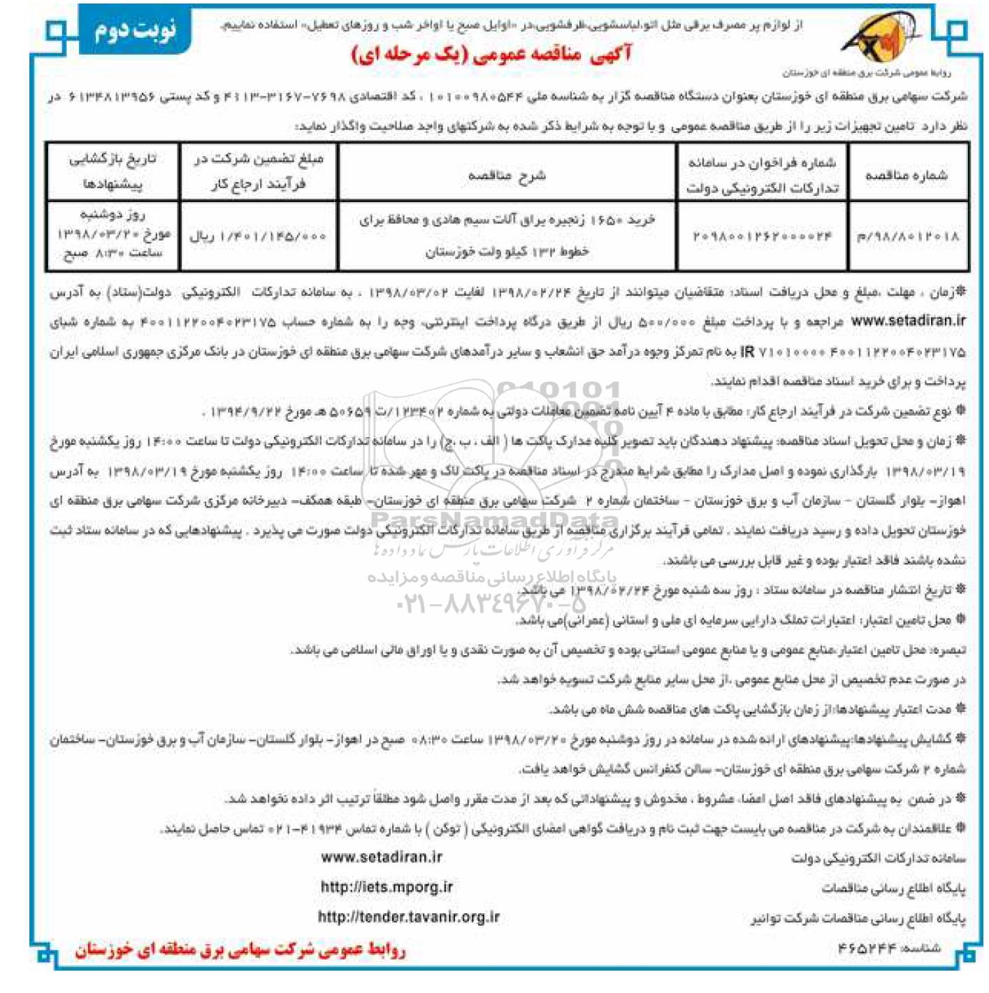 | 8012018/ 98/ l | 2098001262000024 | خرید 1650 زنجیره یراق آلات سیم هادی و محافظ برای خطوط 132 کیلو ولت خوزستان | 1.401.145.000 ریال | روز دوشنبه مورخ 98.3.20 ساعت 8.30 صبح |