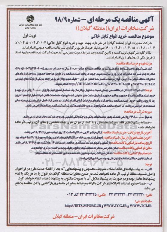 شرکت مخابرات ایران منطقه گیلان در نظر دارد جهت تهیه و خرید انواع کابل خاکی 30/04 ، 50/04 ، 70/04 ، 100/04 ، 150/04 ، 400/04 ، 600/04 مورد نیاز خود از طریق برگزاری تشریفات مناقصه عمومی اقدام نماید