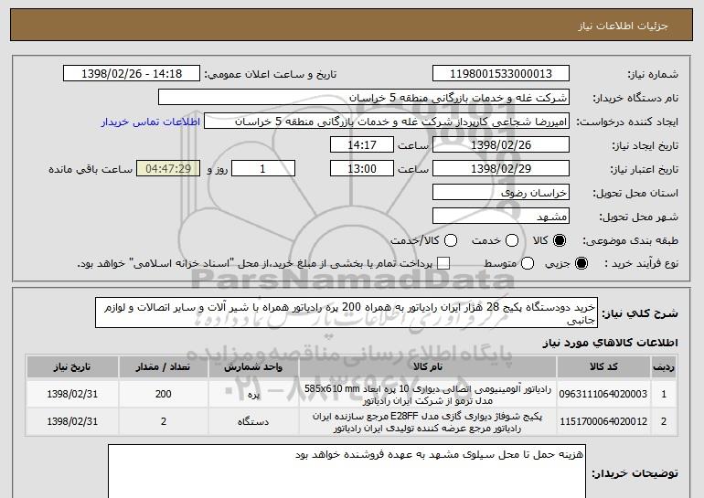 شرح کلی نیاز: خرید دودستگاه پکیج 28 هزار ایران رادیاتور به همراه 200 پره رادیاتور همراه با شیر آلات و سایر اتصالات و لوازم جانبی
