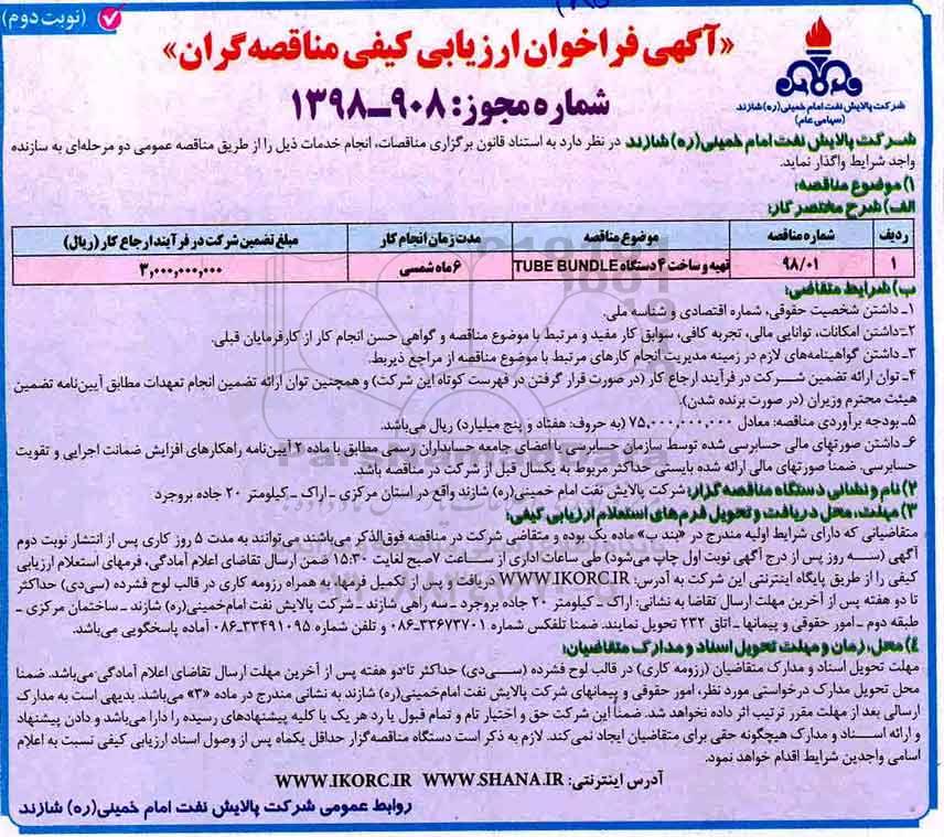 شرکت پالایش نفت امام خمینی (ره) شازند در نظر دارد انجام خدمات ذیل را از طریق مناقصه عمومی دو مرحله ای به سازنده واجد شرایط واگذار نماید.