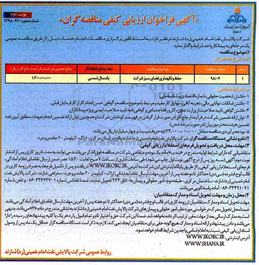 | 98/04 | حفظ و نگهداری فضای سبز شرکت | یکسال شمسی | 1.200.000.000 |