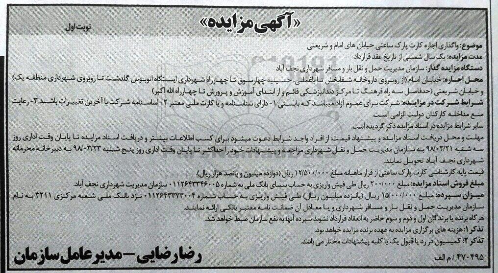 مهلت و محل دریافست اسناد مزایده و پیشنهاد قیمت: از افراد واجد شرایط دعوت میشود برای کسب اطلاعات بیشتر و دریافت اسناد مزایده تا پایان وقت اداری روز سه شنبه 98.3.21 به سازمان مدیریت حمل و نقل شهرداری مراجعه و پیشنهادات خود را حداکثر تا پایان وقت اداری روز پنج شنبه 98.3.23 به دبیرخانه محو شهرداری نجف آباد تحویل نماینده قیمت پایه کارشناسی کارت پارک ساعتی از قرار ماهیانه مبلغ 12.500.000 ریال (دوازده میلیون و پانصد هزار ریال)