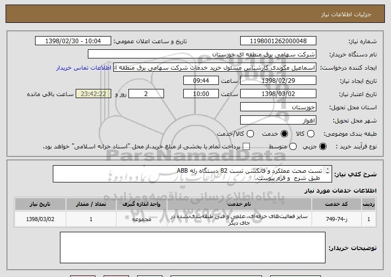استعلام تست صحت عملکرد و فانکشن تست 82 دستگاه رله ABB طبق شرح و فرم پیوست. , استعلام تست صحت عملکرد و فانکشن تست 82 دستگاه رله ABB طبق شرح و فرم پیوست.