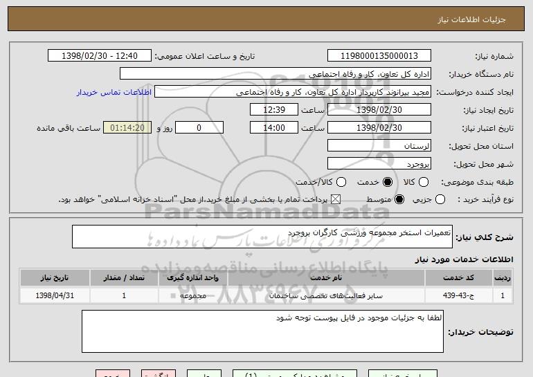 شرح کلی نیاز: تعمیرات استخر مجموعه ورزشی کارگران بروجرد