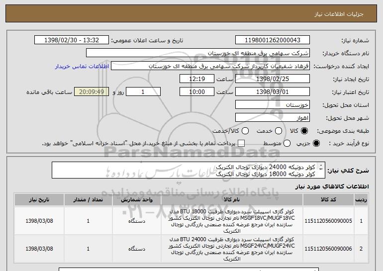 استعلام کولر دوتیکه 24000 دیواری توچال الکتریک کولر دوتیکه 18000 دیواری توچال الکتریک طبق شرح ومشخصات پیوست بارگذاری شده درسامانه, استعلام کولر دوتیکه 24000 دیواری توچال الکتریک کولر دوتیکه 18000 دیواری توچال الکتریک طبق شرح ومشخصات پیوست بارگذاری شده درسامانه