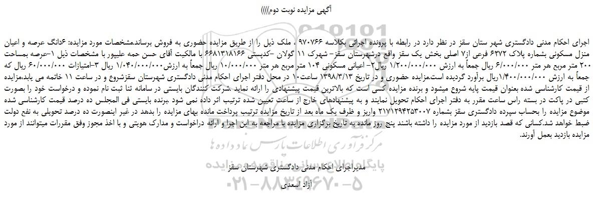 اجرای احکام مدنی دادگستری شهر ستان سقز در نظر دارد در رابطه با پرونده اجرائی بكلاسه 970766 ، ملک ذیل را از طریق مزایده حضوری به فروش برساند.مشخصات مورد مزایده: 6دانگ عرصه و اعیان منزل مسکونی بشماره پلاک 6272 فرعی از7 اصلی بخش یک سقز واقع درشهرستان سقز- شهرک 11 گولان -کدپستی 6681318166 با مالکیت آقای حسن حمه علیپور با مشخصات ذیل 1-عرصه بمساحت 200 متر مربع هر متر 6.000.000 ریال جمعاً به ارزش 1.200.000.000 ریال2- اعیانی مسکونی 104 متر مربع هر متر 10.000.000 ریال جمعاً به ارزش1.040.000.000 ریال 3-امتیازات 60.000.000 ریال که جمعاً به ارزش 1.400.000.000ریال برآورد گردیده است.مزایده حضوری و در تاریخ 1398.3.13 ساعت10 در محل دفتر اجرای احکام مدنی دادگستری شهرستان سقزشروع و در ساعت 11 خاتمه می یابد،مزایده از قیمت کارشناسی شده بعنوان قیمت پایه شروع میشود و برنده مزایده کسی است که بالاترین قیمت پیشنهادی را ارائه نماید .شرکت کنندگان بایستی در سامانه ثنا ثبت نام نموده و درخواست خود را بصورت کتبی در پاکت در بسته راس ساعت مقرر به دفتر اجرای احکام تحویل نمایند و به پیشنهادهای خارج از ساعت تعیین شده ترتیب اثر داده نمی شود .برنده بایستی فی المجلس ده درصد قیمت کارشناسی شده موضوع مزایده را بحساب سپرده دادگستری سقز بشماره 2171294253007 واریز و ظرف یک ماه بعد از تاریخ مزایده ترتیب پرداخت مانده بهای مزایده را بدهد در غیر اینصورت ده درصد تحویلی به نفع دولت ضبط خواهد شد.کسانی که قصد بازدید از مورد مزایده را داشته باشند پنج روز مانده به تاریخ برگزاری مزایده با مراجعه به این اجرا و ارائه دراخواست و مدارک هویتی و با اخذ مجوز وفق مقررات میتوانند از مورد مزایده بازدید بعمل آورند.