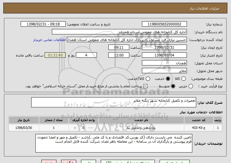 شرح کلی نیاز: تعمیرات و تکمیل کتابخانه شهر زنگنه ملایر