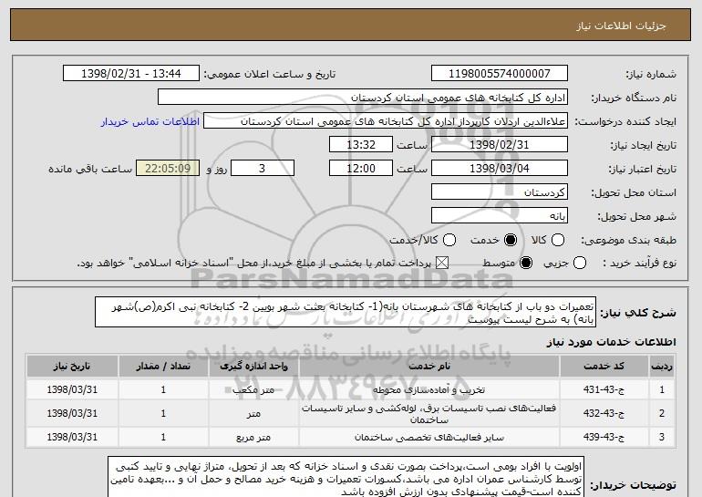 شرح کلی نیاز: تعمیرات دو باب از کتابخانه های شهرستان بانه(1- کتابخانه بعثت شهر بویین 2- کتابخانه نبی اکرم(ص)شهر بانه) به شرح لیست پیوست