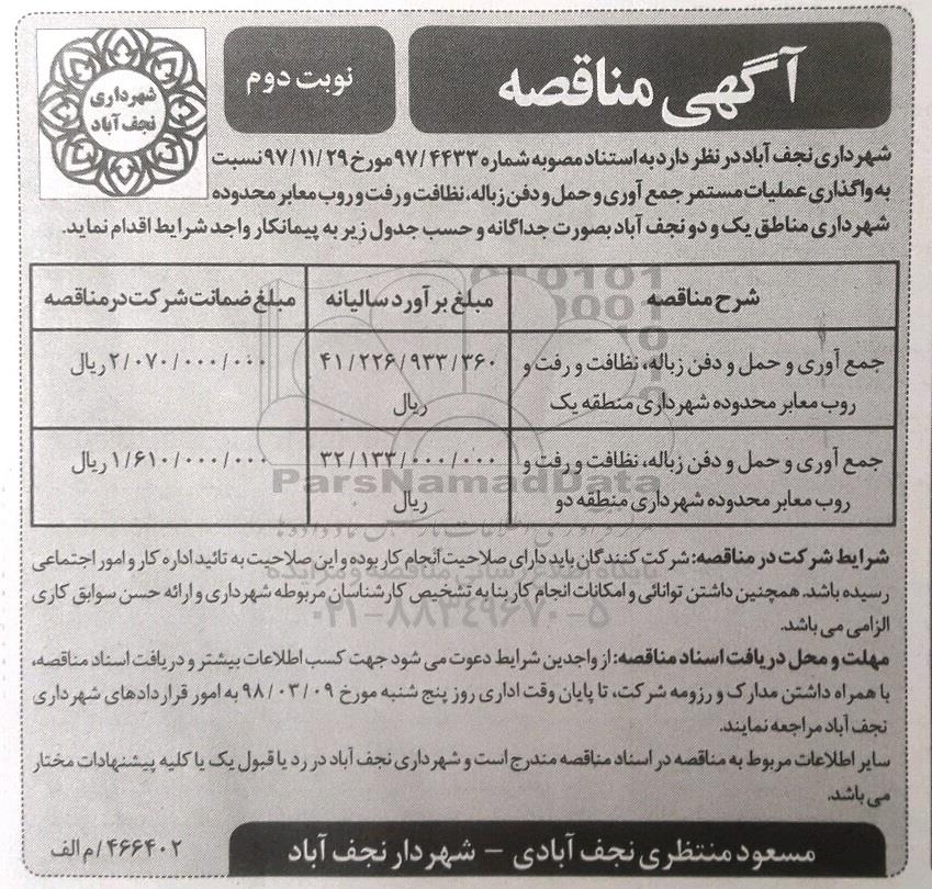 شهرداری نجف آباد در نظر دارد نسبت به واگذاری عملیات مستمر جمع آوری و حمل و دفن زباله، نظافت و رفت و روب معابر محدوده شهرداری مناطق یک و دو نجف آباد به صورت جداگانه و حسب جدول زیر به پیمانکار واجد شرایط اقدام نماید