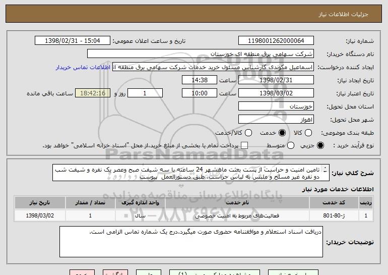 استعلام تامین امنیت و حراست از پست بعثت ماهشهر 24 ساعته با سه شیفت صبح وعصر یک نفره و شیفت شب دو نفره غیر مسلح و ملبس به لباس حراست، طبق دستورالعمل پیوست , استعلام تامین امنیت و حراست از پست بعثت ماهشهر 24 ساعته با سه شیفت صبح وعصر یک نفره و شیفت شب دو نفره غیر مسلح و ملبس به لباس حراست، طبق دستورالعمل پیوست