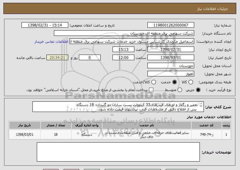 شرح کلی نیاز: تعمیر و رگلاژ و اورهال فیدرهای33 کیلوولت پست ساران دو گنبدان- 18 دستگاه
