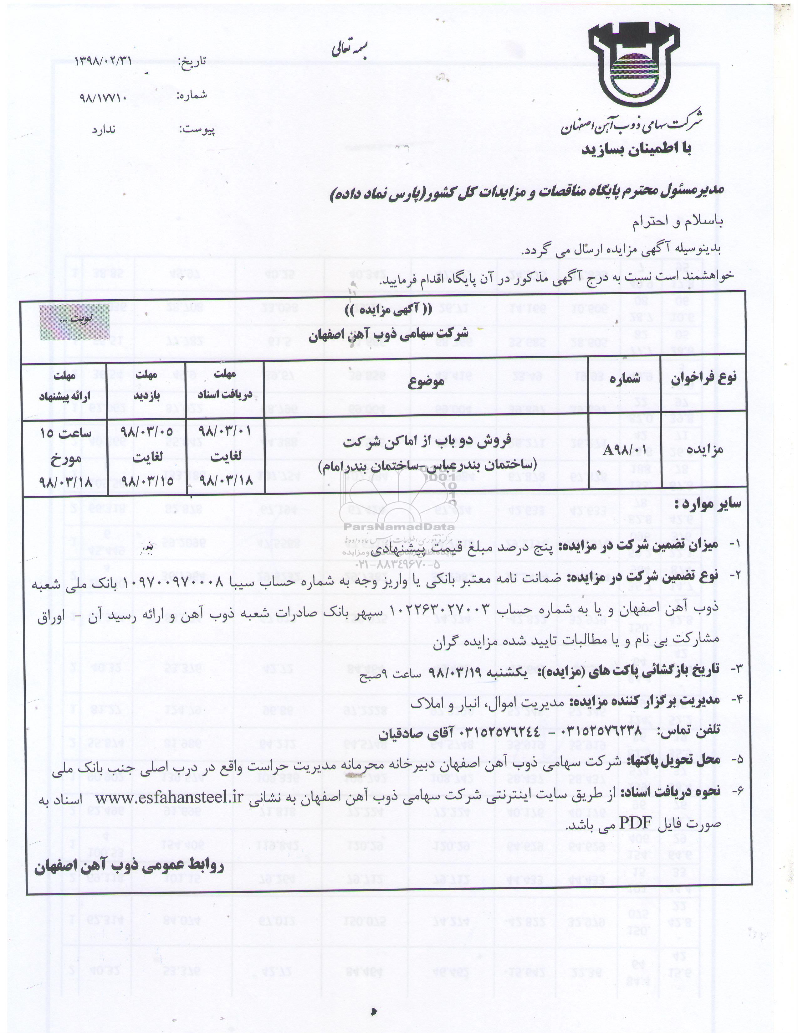 این آگهی به درخواست شرکت ذوب آهن اصفهان طبق نمونه تصویر آگهی صرفا جهت اطلاع رسانی می باشد و شرکت پار نماد داده ها هیچگونه مسئولیتی نسبت به آگهی ندارد.