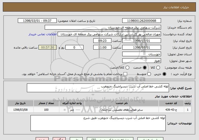 شرح کلی نیاز: لوله کشی خط اصلی آب شرب دیسپاچینگ جنوبغرب