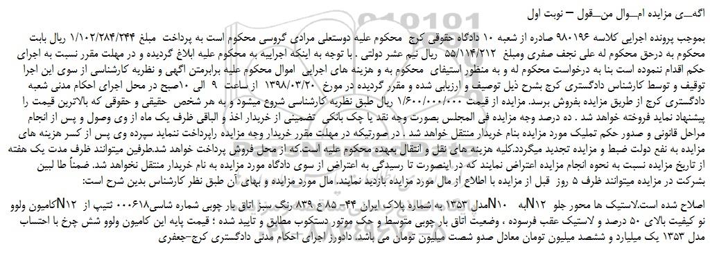 بموجب پرونده اجرایی کلاسه 980196 صادره از شعبه 10 دادگاه حقوقی کرج محکوم علیه دوستعلی مرادی گروسی محکوم است به پرداخت مبلغ 1.102.284.244 ریال بابت محکوم به درحق محکوم له علی نجف صفری ومبلغ 55.114.212 ریال نیم عشر دولتی . با توجه به اینكه اجراییه به محكوم علیه ابلاغ گردیده و در مهلت مقرر نسبت به اجرای حكم اقدام ننموده است بنا به درخواست محكوم له و به منظور استیفای محكوم به و هزینه های اجرایی اموال محكوم علیه برابرمتن اگهی و نظریه کارشناسی از سوی این اجرا توقیف و توسط كارشناس دادگستری كرج بشرح ذیل توصیف و ارزیابی شده و مقرر گردیده در مورخ 1398.03.20 از ساعت 9 الی 10صبح در محل اجرای احكام مدنی شعبه دادگستری كرج از طریق مزایده بفروش برسد. مزایده از قیمت 1.600.000.000 ریال طبق نظریه كارشناسی شروع میشود و به هر شخص حقیقی و حقوقی كه بالاترین قیمت را پیشنهاد نماید فروخته خواهد شد . ده درصد وجه مزایده فی المجلس بصورت وجه نقد یا چك بانكی تضمینی از خریدار اخذ و الباقی ظرف یك ماه از وی وصول و پس از انجام مراحل قانونی و صدور حكم تملیك مورد مزایده بنام خریدار منتقل خواهد شد . در صورتیكه در مهلت مقرر خریدار وجه مزایده راپرداخت ننماید سپرده وی پس از كسر هزینه های مزایده به نفع دولت ضبط و مزایده تجدید میگردد.كلیه هزینه های نقل و انتقال بعهده محكوم علیه است.كه از محل فروش پرداخت خواهد شد.طرفین میتوانند ظرف مدت یك هفته از تاریخ مزایده نسبت به نحوه انجام مزایده اعتراض نمایند كه در اینصورت تا رسیدگی به اعتراض از سوی دادگاه مورد مزایده به نام خریدار منتقل نخواهد شد. ضمناً طا لبین بشركت در مزایده میتوانند ظرف 5 روز قبل از مزایده با اطلاع از مال مورد مزایده بازدید نمایند. مال مورد مزایده و بهای آن طبق نظر كارشناس بدین شرح است: