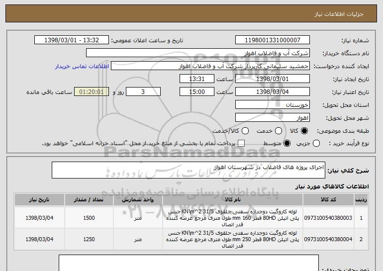 شرح کلی نیاز: اجرای پروژه های فاضلاب در شهرستان اهواز