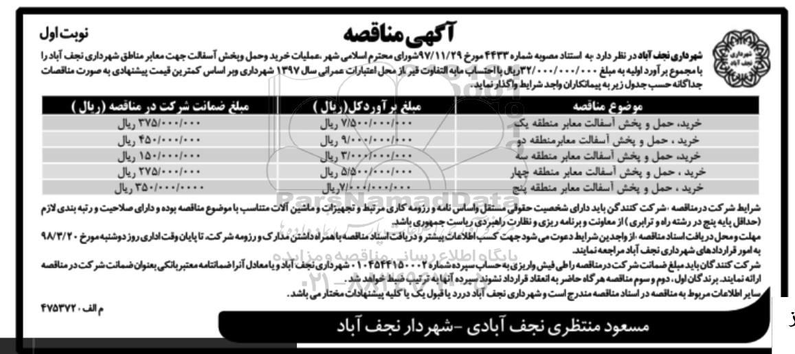 شهرداری نجف آباد در نظر دارد عملیات خرید و حمل و پخش آسفالت جهت معابر مناطق شهرداری نجف آباد را با مجموع برآورد اولیه به مبلغ 32.000.000.000 ریال با احتساب مابه التفاوت قبل از محل اعتبارات عمرانی سال 97 شهرداری و براساس کمترین قیمت پیشنهادی به صورت مناقصات جداگانه حسب جدول زیر به پیمانکاران واجد شرایط واگذار نماید