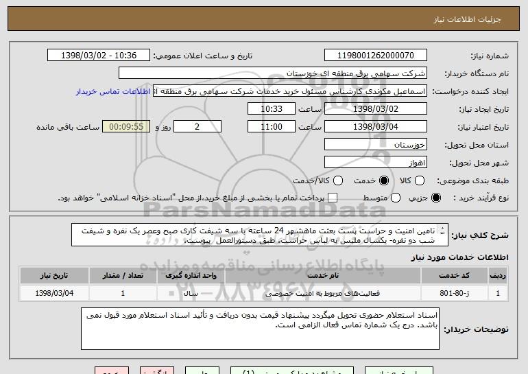 استعلام تامین امنیت و حراست پست بعثت ماهشهر 24 ساعته با سه شیفت کاری صبح وعصر یک نفره و شیفت شب دو نفره- یکسال ملبس به لباس حراست، طبق دستورالعمل پیوست. , استعلام تامین امنیت و حراست پست بعثت ماهشهر 24 ساعته با سه شیفت کاری صبح وعصر یک نفره و شیفت شب دو نفره- یکسال ملبس به لباس حراست، طبق دستورالعمل پیوست.