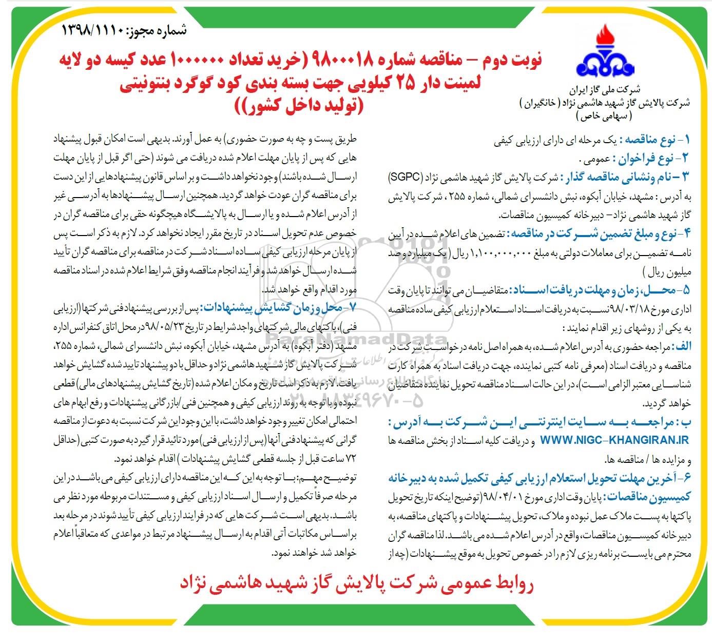 مناقصه شماره 9800018 (خرید 1000000 عدد کیسه دو لایه لمینت دار 25 کیلویی جهت بسته بندی کود گوگرد بنتونیتی (تولید داخل کشور) ؟