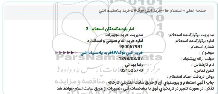 استعلام بها و موضوع استعلام استعلام ، استعلام خرید آنتی فوگ UV خرید پلاستیک انتی به اطلاع کلیه شرکتها و افراد متخصص واجد شرایط میرساند، آگهی گذار در نظر دارد از طریق استعلام بها، نسبت به انتخاب و دریافت پیشنهادات اقدام نماید. این استعلام با کد آگهی ثبت شده در سامانه خبرگزاری پارس نماد : 1661925 منتشر شده است. مشخصات استعلام : تاریخ شروع استعلام: 1398/03/02 آخرین مهلت ارسال پیشنهاد قیمت : 1398/03/07 و محل اجرای پروژه : استان اصفهان میباشد. استعلام قیمت مورد درخواست : استعلام ، استعلام خرید آنتی فوگ UV خرید پلاستیک انتی با دستهبندیهای تخصصی و گروه های مرتبط : مواد پلاستیکی, مواد اولیه کارخانجات, استعلام اطلاع رسانی میگردد.