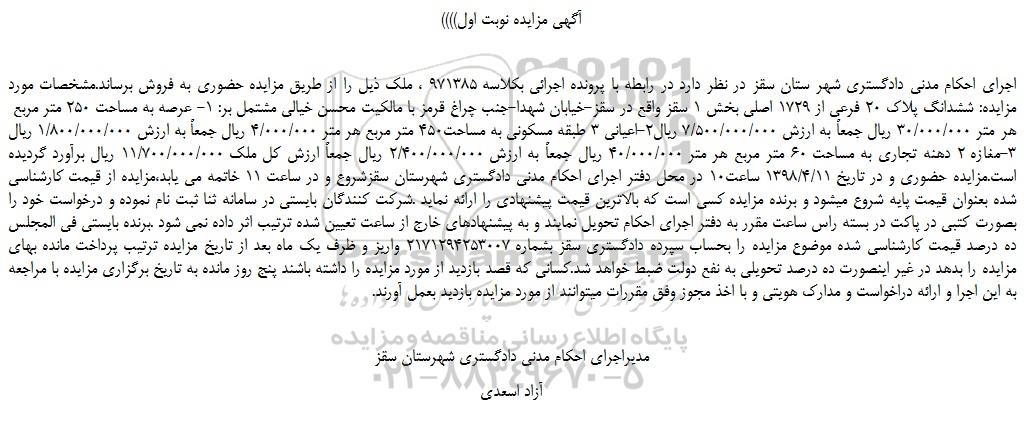 اجرای احکام مدنی دادگستری شهر ستان سقز در نظر دارد در رابطه با پرونده اجرائی بكلاسه 971385 ، ملک ذیل را از طریق مزایده حضوری به فروش برساند.مشخصات مورد مزایده: ششدانگ پلاک 20 فرعی از 1729 اصلی بخش 1 سقز واقع در سقز-خیابان شهدا-جنب چراغ قرمز با مالکیت محسن خیالی مشتمل بر: 1- عرصه به مساحت 250 متر مربع هر متر 30.000.000 ریال جمعاً به ارزش 7.500.000.000 ریال2-اعیانی 3 طبقه مسکونی به مساحت450 متر مربع هر متر 4.000.000 ریال جمعاً به ارزش 1.800.000.000 ریال 3-مغازه 2 دهنه تجاری به مساحت 60 متر مربع هر متر 40.000.000 ریال جمعاً به ارزش 2.400.000.000 ریال جمعاً ارزش کل ملک 11.700.000.000 ریال برآورد گردیده است.مزایده حضوری و در تاریخ 1398.4.11 ساعت10 در محل دفتر اجرای احکام مدنی دادگستری شهرستان سقزشروع و در ساعت 11 خاتمه می یابد،مزایده از قیمت کارشناسی شده بعنوان قیمت پایه شروع میشود و برنده مزایده کسی است که بالاترین قیمت پیشنهادی را ارائه نماید .شرکت کنندگان بایستی در سامانه ثنا ثبت نام نموده و درخواست خود را بصورت کتبی در پاکت در بسته راس ساعت مقرر به دفتر اجرای احکام تحویل نمایند و به پیشنهادهای خارج از ساعت تعیین شده ترتیب اثر داده نمی شود .برنده بایستی فی المجلس ده درصد قیمت کارشناسی شده موضوع مزایده را بحساب سپرده دادگستری سقز بشماره 2171294253007 واریز و ظرف یک ماه بعد از تاریخ مزایده ترتیب پرداخت مانده بهای مزایده را بدهد در غیر اینصورت ده درصد تحویلی به نفع دولت ضبط خواهد شد.کسانی که قصد بازدید از مورد مزایده را داشته باشند پنج روز مانده به تاریخ برگزاری مزایده با مراجعه به این اجرا و ارائه دراخواست و مدارک هویتی و با اخذ مجوز وفق مقررات میتوانند از مورد مزایده بازدید بعمل آورند.
