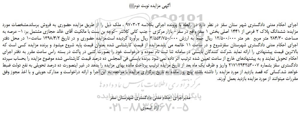 اجرای احکام مدنی دادگستری شهر ستان سقز در نظر دارد در رابطه با پرونده اجرائی بكلاسه 970302 ، ملک ذیل را از طریق مزایده حضوری به فروش برساند.مشخصات مورد مزایده: ششدانگ پلاک 2 فرعی از 1441 اصلی بخش 1 سقز واقع در سقز- بازار مرکزی - جنب کانی کلانتر -کوچه بن بست با مالکیت آقای خالد حجازی مشتمل بر: 1- عرصه به مساحت 284.30 متر مربع هر متر 12.500.000 ریال جمعاً به ارزش 3.553.750.000 ریال برآورد گردیده است.مزایده حضوری و در تاریخ 1398.4.2 ساعت10 در محل دفتر اجرای احکام مدنی دادگستری شهرستان سقزشروع و در ساعت 11 خاتمه می یابد،مزایده از قیمت کارشناسی شده بعنوان قیمت پایه شروع میشود و برنده مزایده کسی است که بالاترین قیمت پیشنهادی را ارائه نماید .شرکت کنندگان بایستی در سامانه ثنا ثبت نام نموده و درخواست خود را بصورت کتبی در پاکت در بسته راس ساعت مقرر به دفتر اجرای احکام تحویل نمایند و به پیشنهادهای خارج از ساعت تعیین شده ترتیب اثر داده نمی شود .برنده بایستی فی المجلس ده درصد قیمت کارشناسی شده موضوع مزایده را بحساب سپرده دادگستری سقز بشماره 2171294253007 واریز و ظرف یک ماه بعد از تاریخ مزایده ترتیب پرداخت مانده بهای مزایده را بدهد در غیر اینصورت ده درصد تحویلی به نفع دولت ضبط خواهد شد.کسانی که قصد بازدید از مورد مزایده را داشته باشند پنج روز مانده به تاریخ برگزاری مزایده با مراجعه به این اجرا و ارائه دراخواست و مدارک هویتی و با اخذ مجوز وفق مقررات میتوانند از مورد مزایده بازدید بعمل آورند.