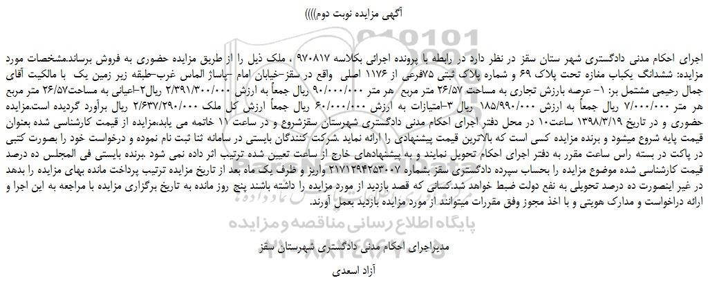 اجرای احکام مدنی دادگستری شهر ستان سقز در نظر دارد در رابطه با پرونده اجرائی بكلاسه 970817 ، ملک ذیل را از طریق مزایده حضوری به فروش برساند.مشخصات مورد مزایده: ششدانگ یکباب مغازه تحت پلاک 69 و شماره پلاک ثبتی 75فرعی از 1176 اصلی واقع در سقز-خیابان امام -پاساژ الماس غرب-طبقه زیر زمین یک با مالکیت آقای جمال رحیمی مشتمل بر: 1- عرصه بارزش تجاری به مساحت 26.57 متر مربع هر متر 90.000.000 ریال جمعاً به ارزش 2.391.300.000 ریال2-اعیانی به مساحت26.57 متر مربع هر متر 7.000.000 ریال جمعاً به ارزش 185.990.000 ریال 3-امتیازات به ارزش 60.000.000 ریال جمعاً ارزش کل ملک 2.637.290.000 ریال برآورد گردیده است.مزایده حضوری و در تاریخ 1398.3.19 ساعت10 در محل دفتر اجرای احکام مدنی دادگستری شهرستان سقزشروع و در ساعت 11 خاتمه می یابد،مزایده از قیمت کارشناسی شده بعنوان قیمت پایه شروع میشود و برنده مزایده کسی است که بالاترین قیمت پیشنهادی را ارائه نماید .شرکت کنندگان بایستی در سامانه ثنا ثبت نام نموده و درخواست خود را بصورت کتبی در پاکت در بسته راس ساعت مقرر به دفتر اجرای احکام تحویل نمایند و به پیشنهادهای خارج از ساعت تعیین شده ترتیب اثر داده نمی شود .برنده بایستی فی المجلس ده درصد قیمت کارشناسی شده موضوع مزایده را بحساب سپرده دادگستری سقز بشماره 2171294253007 واریز و ظرف یک ماه بعد از تاریخ مزایده ترتیب پرداخت مانده بهای مزایده را بدهد در غیر اینصورت ده درصد تحویلی به نفع دولت ضبط خواهد شد.کسانی که قصد بازدید از مورد مزایده را داشته باشند پنج روز مانده به تاریخ برگزاری مزایده با مراجعه به این اجرا و ارائه دراخواست و مدارک هویتی و با اخذ مجوز وفق مقررات میتوانند از مورد مزایده بازدید بعمل آورند.