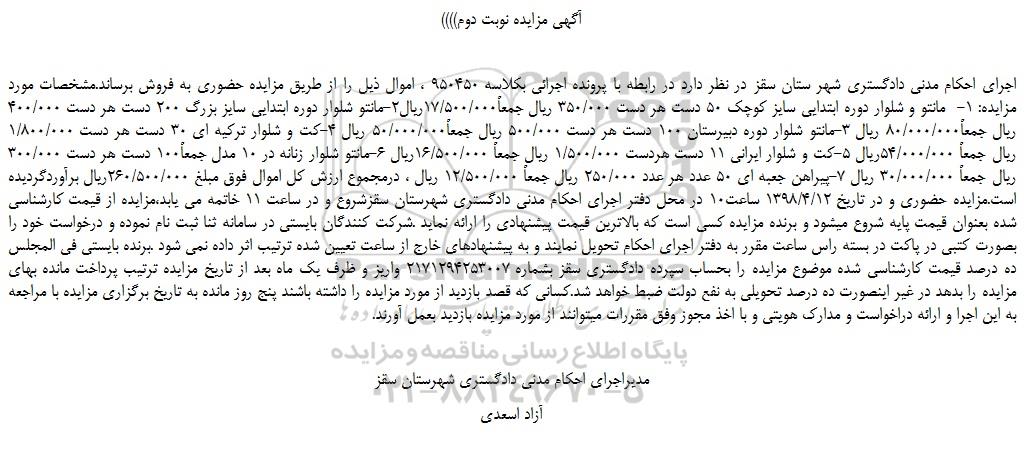 اجرای احکام مدنی دادگستری شهر ستان سقز در نظر دارد در رابطه با پرونده اجرائی بكلاسه 950450 ، اموال ذیل را از طریق مزایده حضوری به فروش برساند.مشخصات مورد مزایده: 1- مانتو و شلوار دوره ابتدایی سایز کوچک 50 دست هر دست 350.000 ریال جمعاً17.500.000ریال2-مانتو شلوار دوره ابتدایی سایز بزرگ 200 دست هر دست 400.000 ریال جمعاً80.000.000 ریال 3-مانتو شلوار دوره دبیرستان 100 دست هر دست 500.000 ریال جمعاً50.000.000 ریال 4-کت و شلوار ترکیه ای 30 دست هر دست 1.800.000 ریال جمعاً 54.000.000ریال 5-کت و شلوار ایرانی 11 دست هردست 1.500.000 ریال جمعاً 16.500.000ریال 6-مانتو شلوار زنانه در 10 مدل جمعاً100 دست هر دست 300.000 ریال جمعاً 30.000.000 ریال 7-پیراهن جعبه ای 50 عدد هر عدد 250.000 ریال جمعاً 12.500.000 ریال ، درمجموع ارزش کل اموال فوق مبلغ 260.500.000ریال برآوردگردیده است.مزایده حضوری و در تاریخ 1398.4.12 ساعت10 در محل دفتر اجرای احکام مدنی دادگستری شهرستان سقزشروع و در ساعت 11 خاتمه می یابد،مزایده از قیمت کارشناسی شده بعنوان قیمت پایه شروع میشود و برنده مزایده کسی است که بالاترین قیمت پیشنهادی را ارائه نماید .شرکت کنندگان بایستی در سامانه ثنا ثبت نام نموده و درخواست خود را بصورت کتبی در پاکت در بسته راس ساعت مقرر به دفتر اجرای احکام تحویل نمایند و به پیشنهادهای خارج از ساعت تعیین شده ترتیب اثر داده نمی شود .برنده بایستی فی المجلس ده درصد قیمت کارشناسی شده موضوع مزایده را بحساب سپرده دادگستری سقز بشماره 2171294253007 واریز و ظرف یک ماه بعد از تاریخ مزایده ترتیب پرداخت مانده بهای مزایده را بدهد در غیر اینصورت ده درصد تحویلی به نفع دولت ضبط خواهد شد.کسانی که قصد بازدید از مورد مزایده را داشته باشند پنج روز مانده به تاریخ برگزاری مزایده با مراجعه به این اجرا و ارائه دراخواست و مدارک هویتی و با اخذ مجوز وفق مقررات میتوانند از مورد مزایده بازدید بعمل آورند.