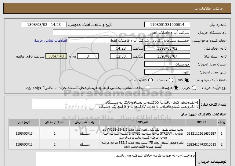 استعلام 1-الکتروموتور کوپله باقدرت 55کیلووات پمپ29-250 دو دسنتگاه 2-الکتروپمپ شناورفاضلاب با قدرت 37کیلووات و 8 اینچ یک دستگاه, استعلام 1-الکتروموتور کوپله باقدرت 55کیلووات پمپ29-250 دو دسنتگاه 2-الکتروپمپ شناورفاضلاب با قدرت 37کیلووات و 8 اینچ یک دستگاه