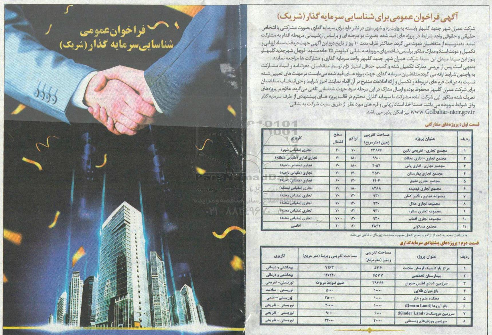 شرکت عمران شهر جدید گلبهار وابسته به وزارت راه و شهرسازی در نظر دارد برای سرمایه گذاری به صورت مشارکتی با اشخاص حقیقی و حقوقی واجد شرایط در پروژه های قید شده به صورت دو مرحله ای و براساس ارزشیابی مربوطه اقدام به مشارکت نماید. بدینوسیله از متقاضیان دعوت می گردد حداکثر ظرف مدت 10 روز از تاریخ درج این اگهی جهت دریافت اسناد ارزیابی و تکمیل و عودت اسناد و مدارک مذکور براساس شاخصهای مربوطه به نشانی کیلومتر 35 جاده مشهد - قوچان شهر جدید گلبهار بلوار ابن سینا میدان ابن سینا شرکت عمران شهر جدید گلبهار واحد سرمایه گذاری و مشارکتها مراجعه نمایند
