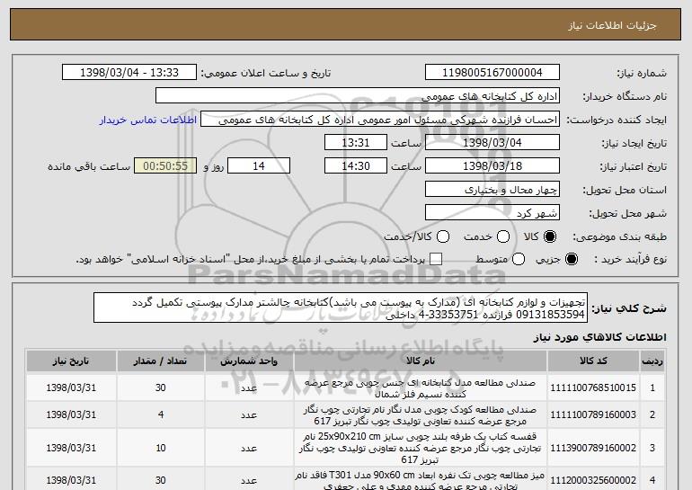 توضیحات خریدارتجهیزات و لوازم کتابخانه ای (مدارک به پیوست می باشد)کتابخانه چالشتر مدارک پیوستی تکمیل گردد 09131853594 فرازنده 33353751-4 داخلی