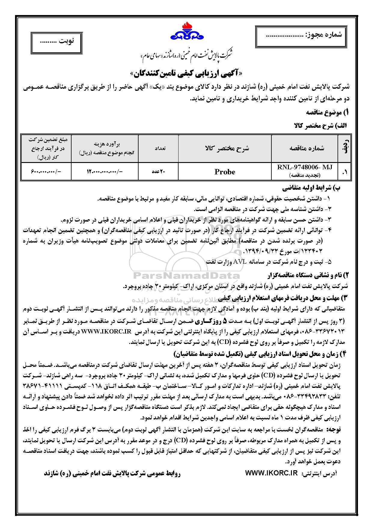 تجدید مناقصه PROBE از کلیه افراد متخصص و شرکتها واجد شرایط دعوت به عمل میآید در مناقصه با کد خبرگزاری پارس نماد: 1666926 شرکت نمایند.