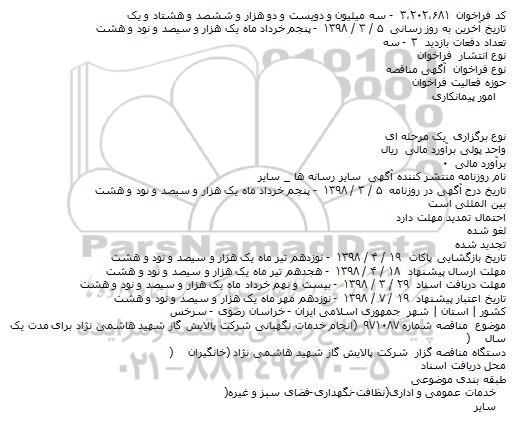 موضوع  مناقصه شماره ٩٧١٠٨٧ (انجام خدمات نگهبانی شرکت پالایش گاز شهید هاشمی ن‍ژاد برای مدت یک سال)