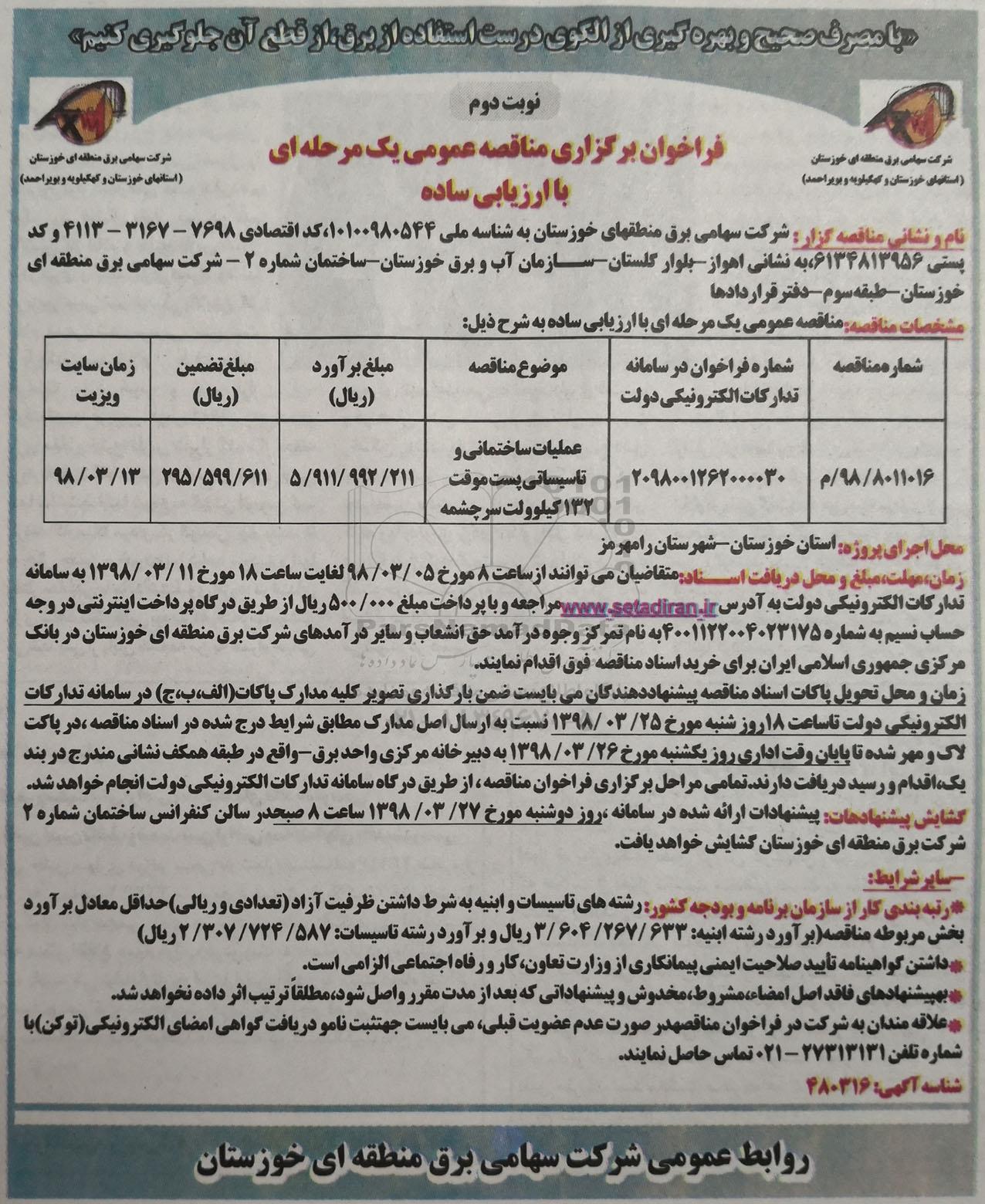 فراخوان عملیات ساختمانی و تاسیساتی پست موقت - نوبت دوم از کلیه افراد متخصص و شرکتها واجد شرایط دعوت به عمل میآید در مناقصه با کد خبرگزاری پارس نماد: 1670013 شرکت نمایند.