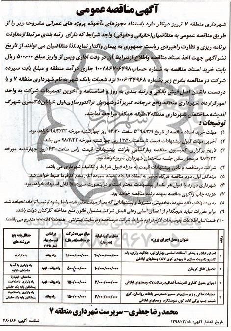 شهرداری منطقه 7 تبریز در نظر دارد به استناد مجوزهای ماخوذه، پروژه های عمرانی مشروحه زیر را از طریق مناقصه عمومی به متقاضیان حقیقی و حقوقی واجد شرایط که دارای رتبه بندی مرتبط از معاونت برنامه ریزی و نظارت راهبردی ریاست جمهوری دارای حداقل رتبه پایه پنج در رشته های راه و ترابری یا ساختمان باشند به پیمان واگذار نماید.