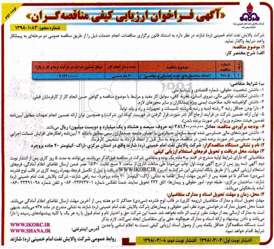 شرکت پالایش نفت امام خمینی (ره) شازند در نظر دارد به استناد قانون برگزاری مناقصات انجام خدمات ذیل را از طریق مناقصه عمومی دو مرحله ای به پیمانکار واجد شرایط واگذار نماید.