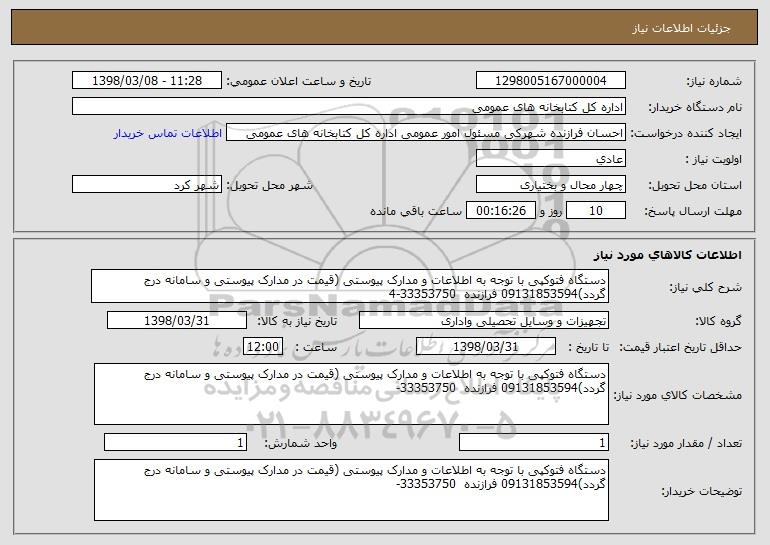 توضیحات خریداردستگاه فتوکپی با توجه به اطلاعات و مدارک پیوستی (قیمت در مدارک پیوستی و سامانه درج گردد)09131853594 فرازنده 33353750-