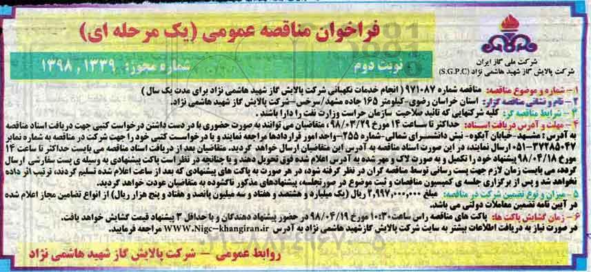 1- شماره و موضوع مناقصه : مناقصه شماره 971087 انجام خدمات نگهبانی در شرکت پالایش گاز شهید هاشمی نژاد برای مدت یکسال