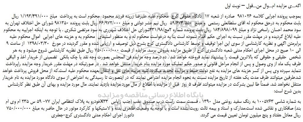 بموجب پرونده اجرایی کلاسه 981026  صادره از شعبه 17  دادگاه حقوقی کرج  محکوم علیه علیرضا زرینه فرزند محمود  محکوم است به پرداخت  مبلغ 1.193.491.000 ریال بابت محکوم به درحق محکوم له اقای سلطانعلی رستمی  و مبلغ  59.674.550  ریال نیم عشر دولتی و مبلغ 66.972.000 ریال بابت پرونده 981350 شورای حل اختلاف تهران به سود محمد احسان راسخی نژاد و مبلغ 184.898.099 ریال بابت پرونده شماره 2مج.431.98شورای حل اختلاف شهرری به سود مرتضی شکری . با توجه به اینکه اجراییه به محکوم علیه ابلاغ گردیده و در مهلت مقرر نسبت به اجرای حکم اقدام ننموده است بنا به درخواست محکوم له و به منظور استیفای  محکوم به و هزینه های اجرایی  اموال محکوم علیه برابرمتن اگهی و نظریه کارشناسی از سوی این اجرا توقیف و توسط کارشناس دادگستری کرج بشرح ذیل توصیف و ارزیابی شده و مقرر گردیده در مورخ  1398.03.30  از ساعت 9  الی 10 صبح در محل اجرای احکام مدنی شعبه دادگستری کرج از طریق مزایده بفروش برسد. مزایده از قیمت 750.000.000 ریال طبق نظریه کارشناسی شروع میشود و به هر شخص  حقیقی و حقوقی که بالاترین قیمت را پیشنهاد نماید فروخته خواهد شد . ده درصد وجه مزایده فی المجلس بصورت وجه نقد یا چک بانکی  تضمینی از خریدار اخذ و الباقی ظرف یک ماه از وی وصول و پس از انجام مراحل قانونی و صدور حکم تملیک مورد مزایده بنام خریدار منتقل خواهد شد . در صورتیکه در مهلت مقرر خریدار وجه مزایده راپرداخت ننماید سپرده وی پس از کسر هزینه های مزایده به نفع دولت ضبط و مزایده تجدید میگردد.کلیه هزینه های نقل و انتقال بعهده محکوم علیه است.که از محل فروش پرداخت خواهد شد.طرفین میتوانند ظرف مدت یک هفته از تاریخ مزایده نسبت به نحوه انجام مزایده اعتراض نمایند که در اینصورت تا رسیدگی به اعتراض از سوی دادگاه مورد مزایده به نام خریدار منتقل نخواهد شد. ضمناً طا لبین بشرکت در مزایده میتوانند ظرف 5 روز  قبل از مزایده با اطلاع از مال مورد مزایده بازدید نمایند. مال مورد مزایده و بهای آن طبق نظر کارشناس بدین شرح است: