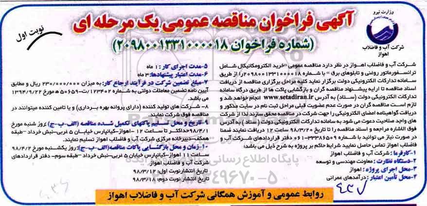 شرکت آب و فاضلاب اهواز در نظر دارد مناقصه عمومی الکترومکانیکال شامل ترانسفورماتور روغنی و تابلوهای برق با شماره 2098001331000018 را از طریق سامانه تدارکات الکترونیکی دولت برگزار نماید کلیه مراحل ارزیابی کیفی از دریافت استعلام های ارزیابی کیفی تا ارائه استعلام های تکمیل شده و اسناد و مدارک مربوطه از طریق درگاه سامانه تدارکات الکترونیکی دولت ستاد به آدرس ستاد انجام خواهد شد و لازم است مناقصه گراندر صورت عدم عضویت قبلی مراحل ثبت نام در سایت مذکور و دریافت گواهینامه امضای الکترونیکی را جهت شرکت در مناقصه محقق سازند لذا از شرکتهای واجد صلاحیت دعوت می شود به سامانه تدارکات الکترونیکی دولت ستاد به آدرس فوق الاشاره مراجعه و اسناد مناقصه را تا تاریخ 98.3.20 ساعت 12 دریافت نمایند ضمنا در صورت نیاز می توانید با شماره 33386509-061 دفتر قراردادهای شرکت آب و فاضلاب اهواز تماس حاصل نمایند