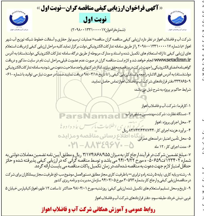 شرکت آب و فاضلاب اهواز در نظر دارد ارزیابی کیفی مناقصه گران مناقصه عملیات ترمیم نوار حفاری و آسفالت خطوط شبکه توزیع آب شهر اهواز با شماره 2098001331000017 را از طریق سامانه تدارکات الکترونیکی دولت برگزار نماید. کلیه مراحل ارزیابی کیفی از دریافت استعلام های ارزیابی کیفی تا ارایه استعلامهای تکمیل شده و اسناد و مدارک مربوطه از طریق درگاه سامانه تدارکات الکترونیکی دولت(ستاد) به آدرس ستاد انجام خواهد شد و لازم است مناقصه گران در صورت عدم عضویت قبلی مراحل ثبت نام در سایت مذکور و دریافت گواهینامه امضای الکترونیکی را جهت شرکت در مناقصه محقق سازند.لذا از شرکتهای واجد صلاحیت دعوت می شود به سامانه تدارکات الکترونیکی دولت (ستاد) به آدرس فوق الاشاره مراجعه و اسناد ارزیابی کیفی را تا تاریخ 98.3.18 دریافت نمایند. ضمنا در صورت نیاز می توانید با شماره 33386509- 061 دفتر قراردادهای شرکت آب و فاضلاب اهواز تماس حاصل نمایید.