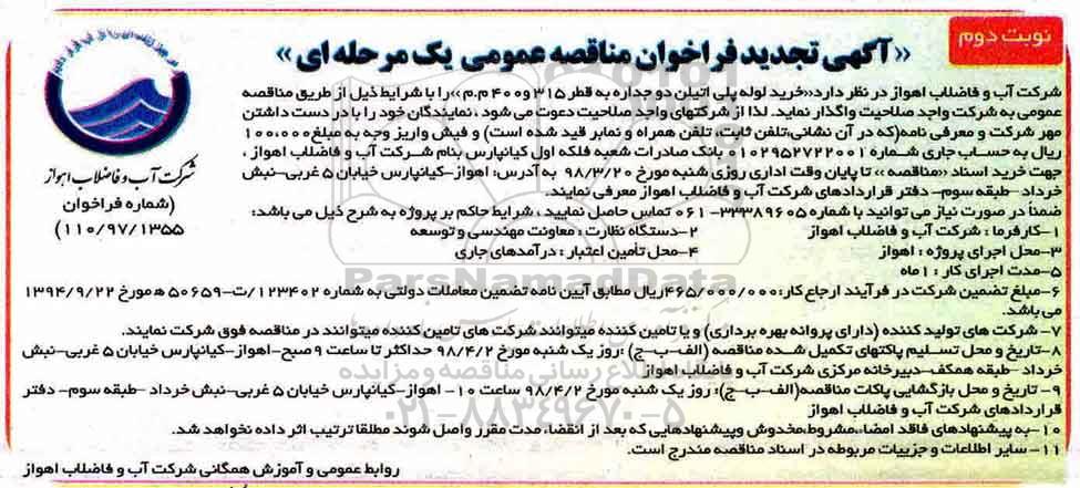 شرکت آب و فاضلاب اهواز در نظر دارد خرید لوله پلی اتیلن دوجداره به قطر 315 و 400 م.م را با شرایط ذیل از طریق مناقصه عمومی به شرکت واجد صلاحیت واگذار نماید. لذا از شرکتهای واجد صلاحیت دعوت می شود ، نمایندگان خود را با در دست داشتن مهر شرکت و معرفی نامه(که در آن نشانی،تلفن ثابت، تلفن همراه و نمابر قید شده است) و فیش واریز وجه به مبلغ 100.000 ریال به حساب جاری شماره ۰۱۰۲۹۵۲۷۲۲۰۰۱ بانک صادرات شعبه فلکه اول کیانپارس بنام شرکت آب و فاضلاب اهواز ، جهت خرید اسناد مناقصه تا پایان وقت اداری روز شنبه مورخ 98.3.20 به آدرس: اهواز-کیانپارس خیابان 5 غربی - نبش خرداد –طبقه سوم- دفتر قراردادهای شرکت آب و فاضلاب اهواز معرفی نمایند.ضمناً در صورت نیاز می توانید با شماره ۳۳۳۸۹۶۰۵- ۰۶۱ تماس حاصل نمایید ، شرایط حاکم بر پروژه به شرح ذیل می باشد: