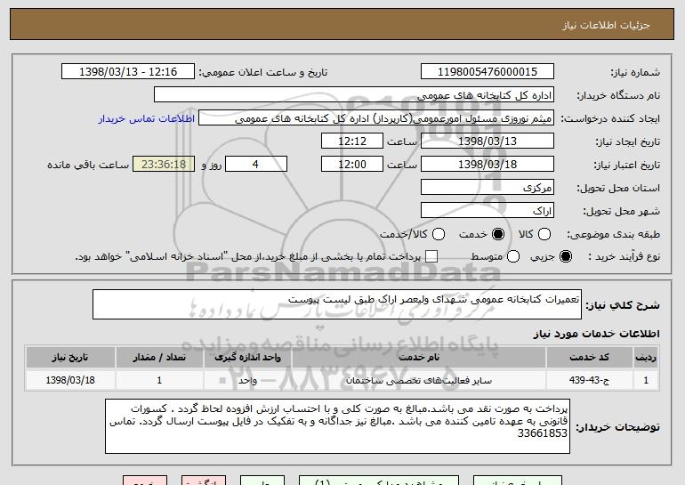 شرح کلی نیاز: تعمیرات کتابخانه عمومی شهدای ولیعصر اراک طبق لیست پیوست