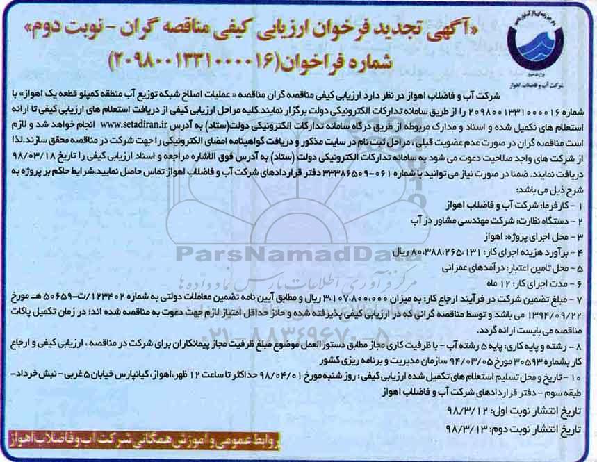 شرکت آب و فاضلاب اهواز در نظر دارد ارزیابی کیفی مناقصه گران مناقصه عملیات اصلاح شبکه توزیع آب منطقه کمپلو قطعه یک اهواز با شماره 2098001331000016 را از طریق سامانه تدارکات الکترونیکی دولت برگزار نماید کلیه مراحل ارزیابی کیفی از دریافت استعلام های ارزیابی کیفی تا ارائه استعلام های تکمیل شده و اسناد و مدارک مربوطه از طریق درگاه سامانه تدارکات الکترونیکی دولت ستاد به آدرس ستاد www.setadiran.ir انجام خواهد شد و لازم است مناقصه گران در صورت عدم عضویت قبلی مراحل ثبت نام در سایت مذکور و دریافت گواهینامه امضای الکترونیکی را جهت شرکت در مناقصه محقق سازند لذا از شرکتهای واجد صلاحیت دعوت می شود به سامانه تدارکات الکترونیکی دولت ستاد به آدرس فوق الاشاره مراجعه و اسناد ارزیابی کیفی را تا تاریخ 98.3.18 دریافت نمایند ضمنا در صورت نیاز می توانید با شماره 33386509-061 دفتر قراردادهای شرکت آب و فاضلاب اهواز تماس حاصل نمایند