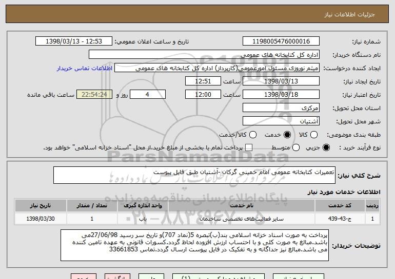 شرح کلی نیاز: تعمیرات کتابخانه عمومی امام خمینی گرکان -آشتیان طبق فایل پیوست