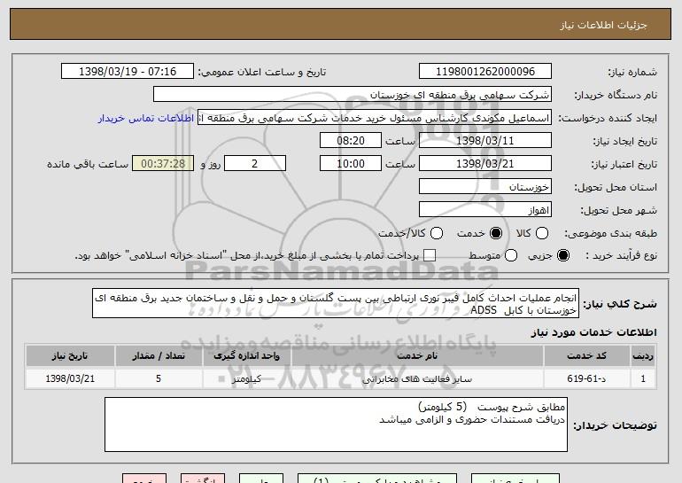 شرح کلی نیاز: انجام عملیات احداث کامل فیبر نوری ارتباطی بین پست گلستان و حمل و نقل و ساختمان جدید برق منطقه ای خوزستان با کابل ADSS