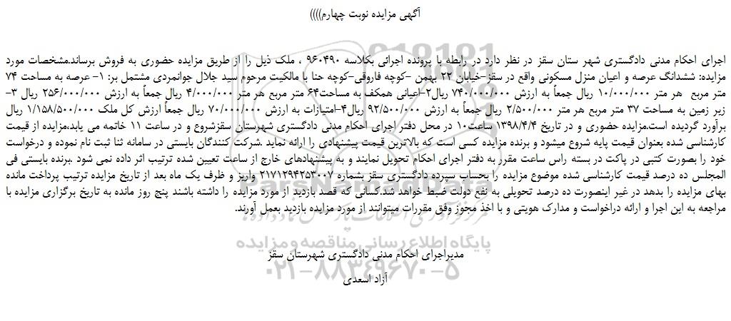 اجرای احکام مدنی دادگستری شهر ستان سقز در نظر دارد در رابطه با پرونده اجرائی بکلاسه 960490 ، ملک ذیل را از طریق مزایده حضوری به فروش برساند.مشخصات مورد مزایده: ششدانگ عرصه و اعیان منزل مسکونی واقع در سقز-خیابان 22 بهمن -کوچه فاروقی-کوچه حنا با مالکیت مرحوم سید جلال جوانمردی مشتمل بر: 1- عرصه به مساحت 74 متر مربع هر متر 10/000/000 ریال جمعاً به ارزش 740/000/000 ریال2-اعیانی همکف به مساحت64 متر مربع هر متر 4/000/000 ریال جمعاً به ارزش 256/000/000 ریال 3-زیر زمین به مساحت 37 متر مربع هر متر 2/500/000 ریال جمعاً به ارزش 92/500/000 ریال4-امتیازات به ارزش 70/000/000 ریال جمعاً ارزش کل ملک 1/158/500/000 ریال برآورد گردیده است.مزایده حضوری و در تاریخ 1398/4/4 ساعت10 در محل دفتر اجرای احکام مدنی دادگستری شهرستان سقزشروع و در ساعت 11 خاتمه می یابد،مزایده از قیمت کارشناسی شده بعنوان قیمت پایه شروع میشود و برنده مزایده کسی است که بالاترین قیمت پیشنهادی را ارائه نماید .شرکت کنندگان بایستی در سامانه ثنا ثبت نام نموده و درخواست خود را بصورت کتبی در پاکت در بسته راس ساعت مقرر به دفتر اجرای احکام تحویل نمایند و به پیشنهادهای خارج از ساعت تعیین شده ترتیب اثر داده نمی شود .برنده بایستی فی المجلس ده درصد قیمت کارشناسی شده موضوع مزایده را بحساب سپرده دادگستری سقز بشماره 2171294253007 واریز و ظرف یک ماه بعد از تاریخ مزایده ترتیب پرداخت مانده بهای مزایده را بدهد در غیر اینصورت ده درصد تحویلی به نفع دولت ضبط خواهد شد.کسانی که قصد بازدید از مورد مزایده را داشته باشند پنج روز مانده به تاریخ برگزاری مزایده با مراجعه به این اجرا و ارائه دراخواست و مدارک هویتی و با اخذ مجوز وفق مقررات میتوانند از مورد مزایده بازدید بعمل آورند.