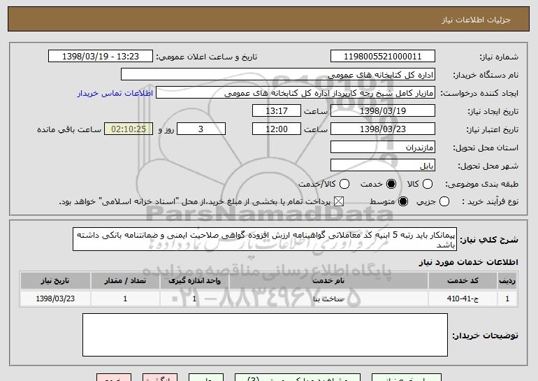 شرح کلی نیاز: پیمانکار باید رتبه 5 ابنیه کد معاملاتی گواهینامه ارزش افزوده گواهی صلاحیت ایمنی و ضمانتنامه بانکی داشته باشد