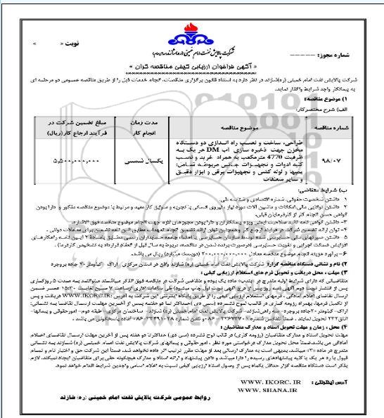 - نام و نشانی دستگاه مناقصه گزار:  شرکت پالایش نفت امام خمینی شازند واقع در استان مرکزی اراک کیلومتر 20 جاده بروجرد- سه راهی شازند