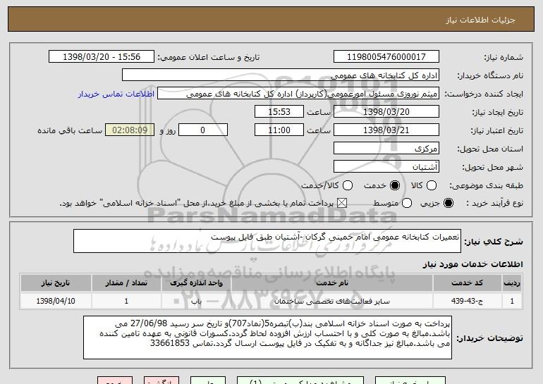 شرح کلی نیاز: تعمیرات کتابخانه عمومی امام خمینی گرکان -آشتیان طبق فایل پیوست